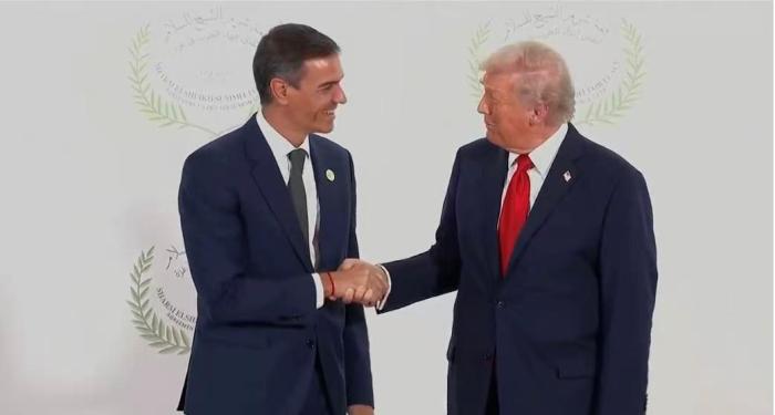 当地时间10月13日,特朗普总统在埃及举行的“和平峰会”上会见西班牙首相桑切斯。
